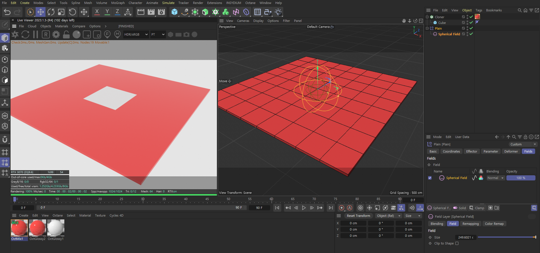 Plane 이펙터에 아무 필드나 생성한 후 생성한 Mix 메테리얼을 Cloner에 적용합니다.